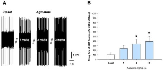 The mean spontaneous firing activity of 5-HT neurons in the agmatine-treated rats was significantly higher than in the vehicle-treated control (Figure 2). This finding was consistent with the previously observed antidepressant, anxiolytic, neuroprotective, and BDNF expression-enhancing effects of chronic agmatine [,,]. It is also consistent with the previous finding that 5-HT neurons expressing nNOS have lower spontaneous firing activity than the non-nNOS expressing ones [].