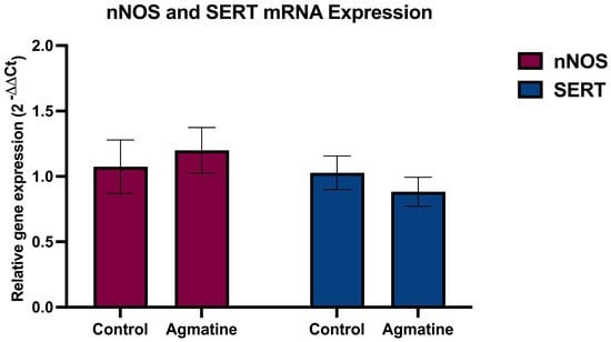 Relative mRNA expression of nNOS and SERT in the DRN of vehicle- and agmatine-treated rats. Data are presented as mean ± SEM. (n = 5 rats per group, two-tailed Student t-test; Mann–Whitney test, p > 0.05). For the raw fluorescence data, see Supplementary Materials.