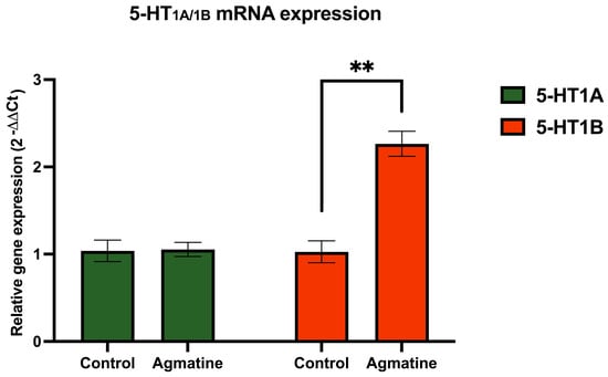 Figure 4 illustrates the effect of chronic agmatine treatment on the mRNA expression of 5-HT receptors belonging to the 5-HT1 subfamily in the DRN. The mRNA encoding the 5-HT1A receptor in the agmatine-treated rats showed no statistical difference compared to the control group. In contrast, the chronic agmatine treatment led to a robust and statistically significant increase in the expression of the 5-HT1B receptor encoding mRNA in the DRN (** p < 0.01, two-tailed Student’s t-test).