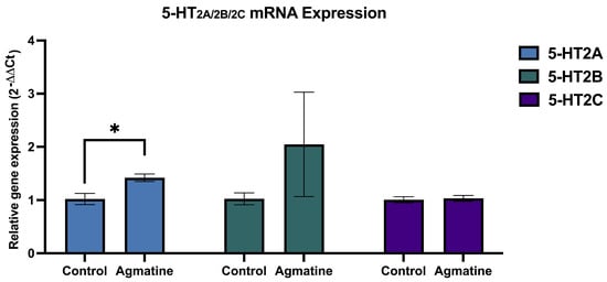 Relative mRNA expression of 5-HT2A, 5-HT2B, and 5-HT2C in the DRN. Significant upregulation of 5-HT2A receptor mRNA expression was observed in agmatine-treated rats. Data are presented as mean ± SEM. (n = 5 rats per group, two-tailed Student’s t-test; Mann–Whitney test, * p < 0.05). For the raw fluorescence data, see Supplementary Materials.