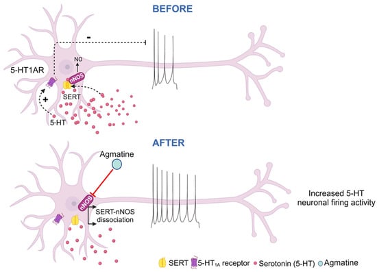 Effect of the chronic agmatine treatment on the excitability of 5-HT neurons; SERT, serotonin (5-HT) transporter; nNOS, neuronal nitric oxide synthase; 5-HT1BR, 5-HT1B receptor; 5-HT2AR, 5-HT2A receptor.