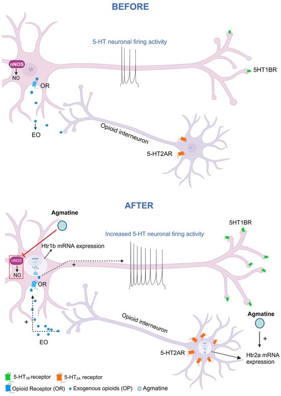 We found that sustained treatment with agmatine led to the increased expression of mRNA coding for 5-HT2A receptors in the DRN (Figure 5). Since 5-HT2A receptors are not known to act as autoreceptors, the 5-HT2A receptor-coding mRNA detected in the DRN is likely to be expressed in the non-5-HT neurons, such as GABAergic and/or opioidergic interneurons [,]. It was reported that the local administration of 5-HT2A/2C receptor agonist (+)-DOI hydrochloride (DOI) into the DRN activated local 5-HT neurons. Another study suggested that the 5-HT2 receptor-modulated stimulation of the DRN 5-HT neurons involved the excitation of opioidergic interneurons []. It is therefore possible that the chronic agmatine-induced stimulation of 5-HT neurons involves a 5-HT2A receptor-based mechanism. The involvement of 5-HT2A receptors in the beneficial CNS effect of agmatine has been previously reported as well. Santos and colleagues [] found that the agmatine-induced antinociception in mice was significantly attenuated by 5-HT2A receptor antagonist ketanserin. Freitas and co-authors [] reported that ketanserin abolished the neuroprotective effect of agmatine in hippocampal neuronal cell culture. The ability of chronic agmatine to upregulate both 5-HT1B and 5-HT2A receptor expression while stimulating 5-HT neuronal firing aligns with the previous evidence that baseline serotonergic signaling may play a protective role against anxiety under normal conditions, though these relationships become more complex following stress exposure (Figure 7).