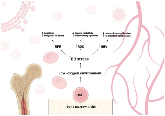 Schematic representation of the main molecular consequences of the conditions that prevail in the bone marrow niche for hematopoietic stem cells (HSCs). A low-oxygen environment increases endoplasmic reticulum (ER) stress levels. As a result, increased ER stress causes an increase in unfolded protein response (UPR) activity, the production of reactive oxygen species (ROS) also increases, and the activity of hypoxia-inducible factors (HIFs).