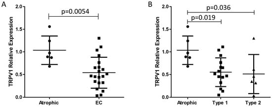 Transcript levels for TRPV1 in endometrial cancer samples. Panel (A): TRPV1 transcript levels were significantly (p = 0.0054) lower in the EC tissue (closed circles) [0.468 (0.318–0.712)]; [median ± IQR]) when compared to that of atrophic tissues (closed squares) [0.933 (0.825–1.322)]. Panel (B): Sub-analysis of the two types of EC revealed that TRPV1 transcript levels were significantly lower in Type 1 EC than in atrophic samples [0.514 (0.320–0.764)] vs. [0.933 (0.825–1.322)]; [median (IQR)], respectively. In addition, a reduction in TRPV1 transcript levels was observed in Type 2 EC (closed triangles) [0.402 (0.245–0.785)], p < 0.05, when compared that of the control (atrophic) group. The Ct values from the RT-qPCR analyses were normalised against the geometric mean of the Ct values for the transcript levels of IPO8, MRPL19 and PPIA, as described in [].