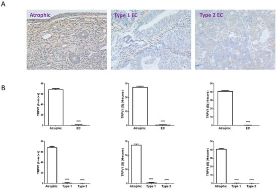 TRPV1 immunohistochemistry staining patterns. Panel (A) shows brown (DAB) staining for TRPV1 in representative sections of control (Atrophic), Type 1 and Type 2 endometrial cancer (EC) tissues. Images were captured at 200× magnification. Staining of both stromal and glandular and luminal epithelial tissue is noted in the control tissue, with slightly higher intensity staining within the stromal compartment. By contrast, overall staining levels in the EC tissues were reduced when compared to the control tissue. Panel (B) shows the histomorphometric analyses for the whole tissue, for the glands (G) alone or the stroma (S) alone. The histoscore (H-score) was significantly reduced in the entire tissue, glands and stroma (top set of graphs) when compared to the atrophic control (**** p < 0.0001; Student’s t-test). Sub-type analysis of the Type 1 and Type 2 EC samples indicated that overall staining H-score levels in both types of EC tissues were reduced when compared to the control tissue (lower set of graphs), regardless of whether the entire tissue, glands and stroma when compared to the atrophic control (**** p < 0.0001; one-way ANOVA with Tukey’s HSD test).
