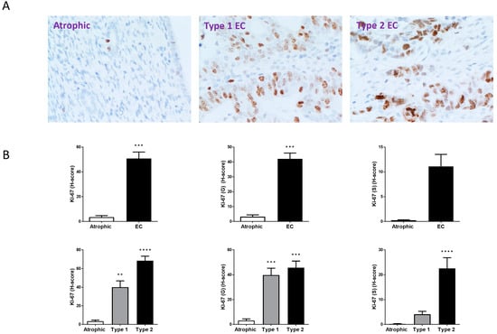 Ki-67 immunohistochemistry staining patterns. Panel (A) shows brown (DAB) staining for Ki-67 in representative sections of control (Atrophic), Type 1 and Type 2 endometrial cancer (EC) tissues. Images were captured at 200× magnification. Staining of both stromal and glandular and luminal epithelial tissue is noted in the control tissue, with slightly higher intensity staining of the stromal compartment. By contrast, overall staining levels in the EC tissues were reduced when compared to the control tissue. Panel (B) shows the histomorphometric analyses for the whole tissue, for the glands (G) alone or the stroma (S) alone. The histoscore (H-score) was significantly reduced in the entire tissue, glands and stroma (top set of graphs) when compared to the atrophic control *** p < 0.001; Student’s t-test). Sub-type analysis of the Type 1 and Type 2 EC samples indicated that overall staining H-score levels in both types of EC tissues were reduced when compared to the control tissue (lower set of graphs), regardless of whether the entire tissue, glands and stroma when compared to the atrophic control (** p < 0.01; *** p < 0.001; **** p < 0.0001; one-way ANOVA with Tukey’s HSD test).
