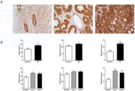 BAX immunohistochemistry staining patterns. Panel (A) shows brown (DAB) staining for BAX in representative sections of control (Atrophic), Type 1 and Type 2 endometrial cancer (EC) tissues. Images were captured at 200× magnification. Staining of both stromal and glandular and luminal epithelial tissue is noted in the control tissue, with slightly higher intensity staining of the stromal compartment. By contrast, overall staining levels in the EC tissues were reduced when compared to the control tissue. Panel (B) shows the histomorphometric analyses for the whole tissue, for the glands (G) alone or the stroma (S) alone. The histoscore (H-score) was significantly reduced in the entire tissue, glands and stroma (top set of graphs) when compared to the atrophic control (** p < 0.01; Student’s t-test). Sub-type analysis of the Type 1 and Type 2 EC samples indicated that overall staining H-score levels in both types of EC tissues were reduced when compared to the control tissue (lower set of graphs), regardless of whether the entire tissue, glands and stroma when compared to the atrophic control (* p < 0.05; ** p < 0.01; one-way ANOVA with Tukey’s HSD test).