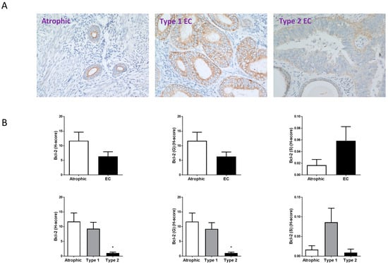 Bcl-2 immunohistochemistry staining patterns. Panel (A) shows brown (DAB) staining for Bcl-2 in representative sections of control (Atrophic), Type 1 and Type 2 endometrial cancer (EC) tissues. Images were captured at 200× magnification. Staining of both stromal and glandular and luminal epithelial tissue is noted in the control tissue, with slightly higher intensity staining of the stromal compartment. By contrast, overall staining levels in the EC tissues were reduced when compared to the control tissue. Panel (B) shows the histomorphometric analyses for the whole tissue, for the glands (G) alone or the stroma (S) alone. The histoscore (H-score) was unaffected in the entire tissue, glands and stroma (top set of graphs) when compared to the atrophic control * p > 0.05; Student’s t-test). Sub-type analysis of the Type 1 and Type 2 EC samples indicated that overall staining H-score levels in Type 2 EC tissues were reduced when compared to the control tissue (lower set of graphs), regardless of whether the entire tissue, glands and stroma when compared to the atrophic control (* p < 0.05; one-way ANOVA with Tukey’s HSD test).
