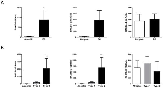 Effect of EC Type on ‘the Hallmark of Apoptosis’. Panel (A) shows the relative expression of the pro-apoptotic marker BAX when compared to the expression of the anti-apoptotic marker Bcl-2 in atrophic and endometrial cancer tissues. The BAX:Bcl-2 ratio is higher in EC with the significant effect associated with glandular (G) structures alone (* p < 0.05; Student’s t-test). Stromal tissues (S) do not contribute to the BAX:Bcl-2 ratio. Sub-group analysis (panel (B)) indicated this effect was confined to Type 2 EC where a significant elevation of the apoptosis effects was confined to the glandular (G) tissue (*** p < 0.001; one-way ANOVA with Tukey’s HSD test compared to the control atrophic tissue).