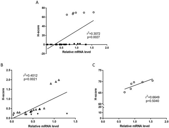 Correlation between transcript and protein levels. Panel (A) shows the expected relationship between TRPV1 protein levels determined by H-scores and TRPV1 transcript levels determined by RT-qPCR for the entire set of data. The clear demarcation between H-score values for the atrophic samples (open circles) and the endometrial cancer samples (closed circles) resulted in additional correlations being created for EC alone (Panel (B)) and for the atrophic controls alone (Panel (C)). In Panel B, the Type 1 EC samples are shown as open triangles and the Type 2 EC samples are shown as closed triangles. The square of the Pearson correlation coefficient (r2) is shown together with its attendant p-value.