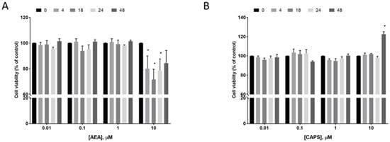 Effect of AEA and capsaicin treatment on Ishikawa cell viability and growth. Panel (A) shows the effect of graded doses of AEA on the viability of Ishikawa cells measured by XTT assay at the indicated times (4, 18, 24 or 48 h). Data are shown as mean ± SD of 12 independent measurements. Panel (B) shows the effect of equivalent doses of the TRPV1-specific agonist capsaicin (CAPs) on cell viability at the indicated times; * p < 0.05 two-way ANOVA with multiple comparisons test.