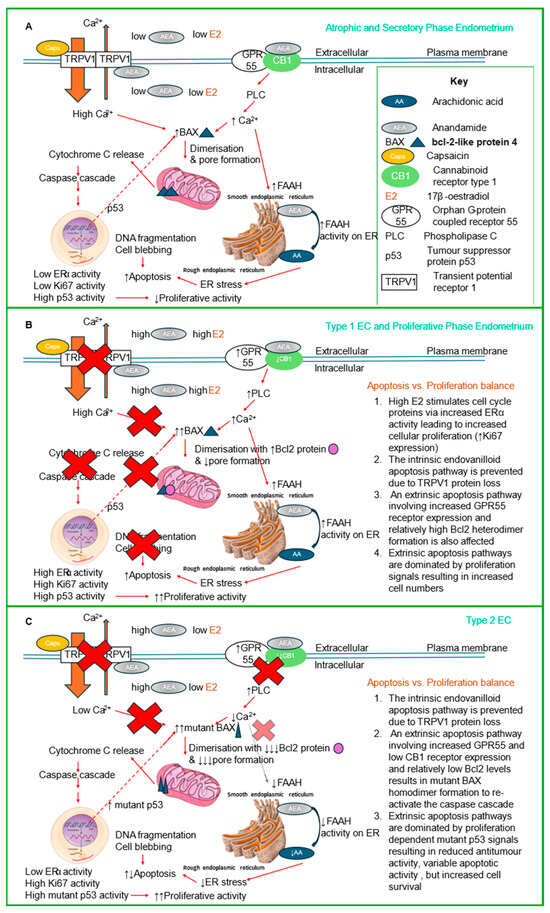 A putative mechanism for TRPV1 and its inactivation in the normal endometrial epithelial cell and in endometrial cancer cell survival. Panel (A) shows the key steps that TRPV1 and AEA play in the normal endometrial epithelial cell. The relatively higher concentrations of TRPV1 and low concentrations of AEA activate the TRPV1 in different ways. Capsaicin binding to the extracellular surface of TRPV1 opens the Ca2+ ion channel to allow calcium influx. By contrast, AEA binding to the inner surface of TRPV1 induce a small efflux of calcium ions. The resultant higher intracellular Ca2+ ion concentrations have two main effects: (1) to allow two BAX molecules to translocate from the cytoplasm to the outer mitochondrial membrane, where bound as a homodimer it opens a pore that allows cytochrome c to escape. The cytochrome c then activates the caspase cascade to initiate DNA fragmentation and cell blebbing that characterises the intrinsic pathway of apoptosis. These cells also have a high tumour suppressor activity in the p53 protein that prevents BAX protein production and a low level of cell cycle proteins. In this proposed model, the relatively low levels of AEA also bind to the relative high levels of the CB1 receptor that homodimerizes with GPR55 producing increased PLC production and through an extrinsic apoptosis pathway results in (2) the mobilisation of FAAH (FAAH-1) to the membrane of the endoplasmic reticulum, where AEA is converted to arachidonic acid (AA), which in turn causes endoplasmic reticulum stress. The stress at the endoplasmic reticulum also leads to cellular apoptosis through various and diverse pathways. The low levels of the steroid hormone 17β-oestradiol (the main inducer of endometrial epithelial cell division) prevent cellular proliferation. So, in this context, the balance of intrinsic and extrinsic apoptosis dominates over cellular proliferation to maintain tissue homeostasis of atrophic and non-proliferative secretory phase endometria of the menstrual cycle. In the case of proliferative endometria and in Type 1 EC (panel (B)), the over-riding event is 17β-oestradiol activating its cognate receptor ERα to induce the transcription of cell cycle genes and initiate proliferation. Simultaneously, the TRPV1 receptor disappears, and the intrinsic apoptosis pathway is inhibited (red crosses). The AEA-dependent extrinsic pathway remains active, despite CB1 expression being reduced, resulting in an increased cell proliferation/apoptosis ratio that leads to increased tumorigenesis. In the case of Type 2 EC (panel (C)), the key factor involved is mutated proteins. The p53 and BAX proteins are often mutants that have altered activities due to their elongated half-lives. In Type 2 EC, both intrinsic and extrinsic apoptotic pathways are inhibited by the complete loss of TRPV1 and the complete loss of CB1, respectively. The extrinsic pathway is completely inhibited, whilst a small amount of intrinsic activity occurs because mutated p53 allows the formation of excess mutated BAX that remains active at the mitochondrial membrane. Other serum factors (primarily EGF) signal cell cycle and cell proliferation events. In Type 2 EC, cell survival dominates over cell death to allow epithelial cell proliferation and accumulation. Other factors, such as TRPV2, might be involved in the cell migration and metastatic potential prevalent in Type 2 EC. Data collated from this study and [,,,,,,,,,,,,,,,].