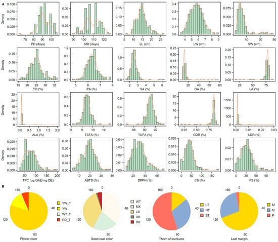 Distribution of quantitative traits and categorical characteristics in safflower accessions. (A) Density plots showing the distribution of quantitative traits, including flowering date (FD), maturing date (MD), leaf length (LL), leaf width (LW), 1000-seed weight (SW), total oil content (TO), palmitic acid (PA), stearic acid (SA), oleic acid (OA), linoleic acid (LA), alpha-linolenic acid (ALA), total saturated fatty acids (TSFA), total unsaturated fatty acids (TUFA), oleic de-saturation ratio (ODR), linoleic de-saturation ratio (LDR), total phenolic content (TPC), ABTS and DPPH assays, N-(p-coumaroyl)serotonin (CS); N-feruloylserotonin (FS). (B) Pie charts representing the proportions of categorical traits, including flower color (yellow, yellow_T, white_T, and red_T), seed coat color (white, mixed, light brown, dark brown, and brown), thorn presence on involucre (long thorn, no thorn, and short thorn), and leaf margin characteristics (many, no, or present).