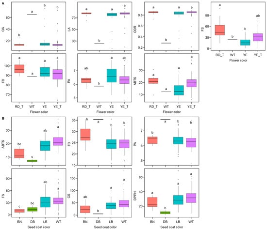 Box plots showing the variation in quantitative traits across different flower color (FC) and seed coat color (SCC) types in safflower. (A) The traits analyzed include oleic acid (OA), linoleic acid (LA), oleic de-saturation ratio (ODR), N-feruloylserotonin (FS), flowering date (FD), palmitic acid (PA), and ABTS. FC types are categorized as Red_T (RD_T), White (WT), Yellow (YE), and Yellow_T (YE_T). (B) The traits analyzed include 2,2′-azino-bis(3-ethylbenzothiazoline-6-sulfonic acid) (ABTS), total oil content (TO), palmitic acid (PA), N-feruloylserotonin (FS), N-(p-coumaroyl)serotonin (CS), and 2,2-Diphenyl-1-picrylhydrazyl (DPPH). SCC types are categorized as brown (BN), dark brown (DB), light brown (LB), and white (WT). Different letters (a, b, c) above the boxes indicate statistically significant differences among groups (p < 0.05) as determined by Duncan’s multiple range test.