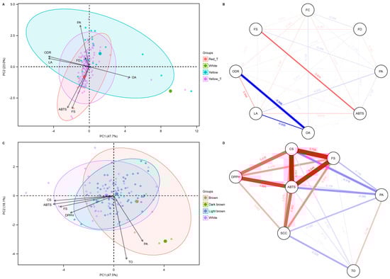 Principal component analysis (PCA) and correlation network of quantitative traits in safflower accessions grouped by flower color (FC) and seed coat color (SCC) types. (A) PCA biplot showing the distribution of safflower accessions based on quantitative traits, with the first principal component (PC1, 47.7%) and the second principal component (PC2, 23.0%) explaining the variance. Vectors represent the contributions of key traits, including oleic acid (OA), linoleic acid (LA), palmitic acid (PA), oleic desaturation ratio (ODR), 2,2′-azino-bis(3-ethylbenzothiazoline-6-sulfonic acid) (ABTS), flowering date (FD), and N-feruloylserotonin (FS). Groups are differentiated by flower color types: Red_T (RD_T), White (WT), Yellow (YE), and Yellow_T (YE_T). (B) Correlation network depicting the relationships between quantitative traits. Edges represent correlations, with thickness and color indicating the strength and direction of the correlation (red for positive, blue for negative). Notable correlations include strong positive correlations between ODR and LA, and a strong negative correlation between ODR and OA. This network highlights the interconnectedness of their influence on FC in safflower. (C) PCA biplot based on SCC. The PCA biplot reveals the distribution of safflower accessions according to SCC, with PC1 (47.5%) and PC2 (23.1%) explaining the variance. The vectors indicate the contributions of traits such as ABTS, N-(p-coumaroyl)serotonin (CS), FS, 2,2-Diphenyl-1-picrylhydrazyl (DPPH), PA, and total oil content (TO), with different seed coat color groups—brown (BN), dark brown (DB), light brown (LB), and WT—showing distinct clustering patterns. (D) Correlation network based on SCC. Notable patterns include strong positive correlations between CS and ABTS, and between ABTS and FS, as well as significant negative correlations between SCC and PA and TO.