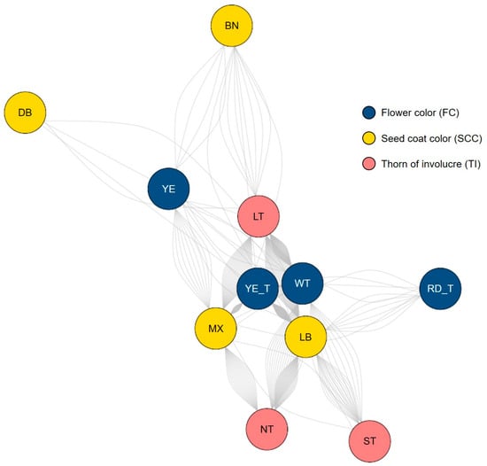 The network analysis of qualitative traits revealed significant associations between FC, SCC, and TI. Nodes representing YE_T and WT in the FC category, LT in the TI category, and MX and LB in the SCC category emerged as central hubs, indicating their pivotal roles in the network. Specifically, YE_T was strongly associated with SCC categories LB and MX, while WT showed a strong connection with LT in the TI category. These findings suggest that flower colour may serve as a phenotypic marker for predicting seed coat colour and thorn morphology—traits that are critical for safflower’s adaptability and agronomic utility. The observed clustering and edge densities emphasize the complex interplay between FC and qualitative traits, underscoring the potential of network-based approaches to identify key trait combinations for targeted breeding [14].