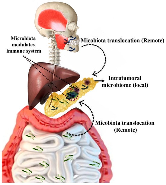 The term “oncobiome” describes the research on the impact of the microbiome on human cancer development []. Accumulating evidence now strongly supports the involvement of microbes in different malignancies, including pancreatic cancer. Microorganisms may affect pancreatic cancer progression via local or systemic mechanisms (Figure 1) []. Locally, microbes can influence tumor progression by modulating immune responses, inducing inflammatory pathways and altering cellular metabolism. In the context of the pancreas, which was traditionally considered a sterile organ, multiple studies have demonstrated the presence of microbial flora. Preclinical studies indicate that these microbes can directly interact with the tumor microenvironment and even affect the metabolism of chemotherapeutic drugs in the pancreas []. On the systemic level, microbial products such as metabolites or endotoxins, secreted into the circulation, can affect the systemic antitumor response or reach the TME via the bloodstream and modulate tumor growth. Interestingly, some of the established PDAC risk factors, including smoking [], alcohol consumption and obesity [,], are known to affect the gut microbiome. Moreover, correlational studies indicate that patients with PDAC harbor a distinct gut microbiome signature []. In summary, the gut microbiota influences the initiation and progression of PDAC; however, the precise mechanisms underlying this complex interaction remain unclear, emphasizing the need to further explore the microbiome’s involvement in PDAC. This review highlights recent progress in microbiome research related to PDAC and also identifies the existing knowledge gaps and proposes future directions to address the challenges comprehensively. This review is based on a thorough analysis of peer-reviewed articles and research papers sourced from reputable databases, including Scopus and PubMed. Relevant studies were identified using keywords such as “pancreatic cancer”, “gut microbiome”, “microbiota and carcinogenesis” and “immune response in pancreatic tumors”. Articles were selected based on the relationship between the gut microbiota and pancreatic carcinogenesis, emphasizing recent findings and advances highlighting the role of the microbiome in tumor progression and therapeutic implications.