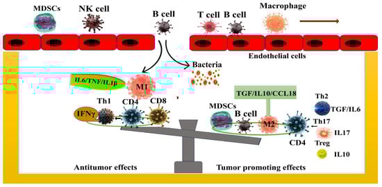 The microbiota shapes the immune microenvironment of the tumor: Within the TME (tumor microenvironment), the microbiota triggers the immune system and attracts immune cells. Under the influence of the microbiota, these immune cells undergo differentiation into distinct immune cell subtypes that secrete specific factors which exert either anti- or pro-neoplastic effects. For example, the presence of microbiota could lead to a decrease in immune cells known for their antitumor effects, such as CD8+ T cells, M1 macrophages (releasing IL-β/IL6/TNF) and Th1 cells (from CD4+ T cells and secreting IFN-γ). Conversely, microbiota could elevate immune cells with pro-tumorigenic effects, which include B cells, M2 macrophages (secreting IL10/TGF/CCL18), MDSCs, and Th2 (CD4+ cells; secreting IL6/TGF), Th17 (secreting IL17) and Treg (secreting IL-10) cells.