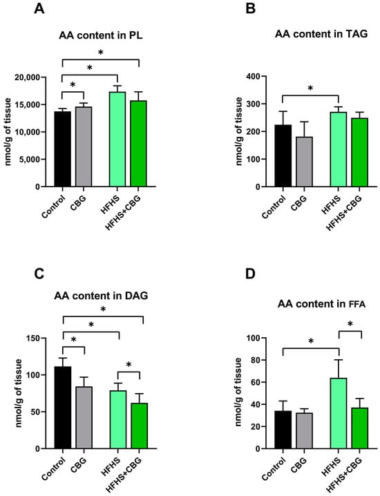 In PL fraction, the arachidonic acid (AA) content was higher in the rats from the CBG, HFHS, and HFHS+CBG groups (CBG: +6.4%, HFHS: +26.1%, HFHS+CBG: +14.5%, p < 0.05, Figure 1A) than in those from the Control group. In TAG, the content of AA was also increased in the HFHS group (HFHS: +18.2%, p < 0.05, vs. Control group, Figure 1B). The decrease in the AA level in DAG fraction was also noticed in all experimental groups (CBG: −24.3%, HFHS: −29.2%, HFHS+CBG: −44.4%, p < 0.05, vs. Control group, Figure 1C). In the same lipid fraction, the content of AA was decreased in the HFHS+CBG group (HFHS+CBG: −21.6%, p < 0.05, Figure 1C) in comparison with the HFHS group. Moreover, the AA concentration of FFA increased under HFHS conditions (HFHS: +42.2%, p < 0.05, vs. Control group, Figure 1D) and then reduced after CBG treatment (HFHS+CBG: −42.0%, p < 0.05, vs. HFHS group, Figure 1D).