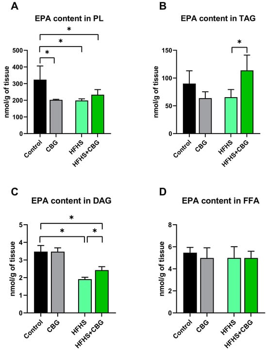 In PL, the eicosapentaenoic acid (EPA) level was decreased in all examined groups (CBG: −37.4%, HFHS: −38.5%, HFHS+CBG: −28.0%, vs. Control group, p < 0.05, Figure 2A). In the HFHS+CBG group, the content of EPA in TAG pool was enhanced (HFHS+CBG: +44.0%, p < 0.05, Figure 2B) compared to the HFHS group. Additionally, we observed an increase in the EPA level of DAG in the HFHS+CBG group (HFHS+CBG: +45.7%, vs. HFHS group, p < 0.05 Figure 2C) and a decrease in the HFHS and HFHS+CBG groups (HFHS: −44.9%, HFHS+CBG: −30.2%, vs. Control group, p < 0.05 Figure 2C). Any significant change in the EPA content in FFA fraction was noticed (p > 0.05, Figure 2D).
