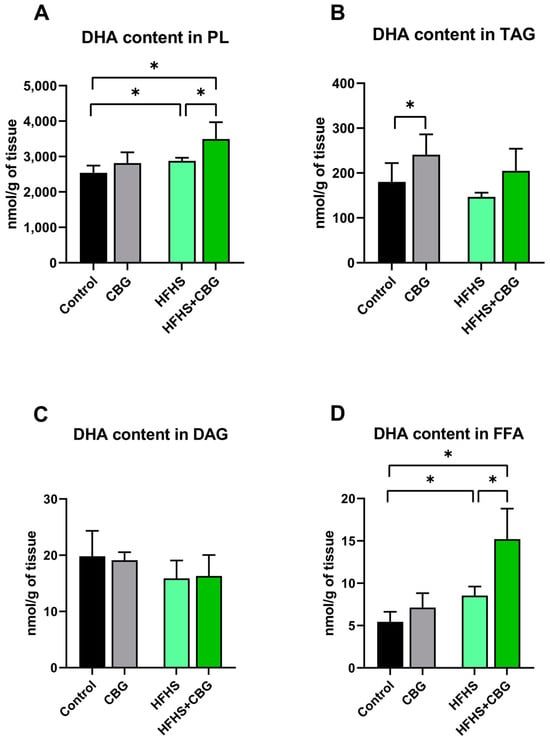The content of docosahexaenoic acid (DHA) was increased in PL in rats fed an HFHS diet (HFHS: +13.3%, HFHS+CBG: +37.6% and +21.4%, p < 0.05, Figure 3A) in comparison with the Control and HFHS groups, respectively. CBG supplementation to the rats fed a standard diet resulted in an increment in the DHA content in TAG fraction (CBG: +33.7%, p < 0.05, vs. Control group, Figure 3B). In DAG fraction, the DHA level remained statistically unchanged (p > 0.05, Figure 3C). Additionally, we noticed an enhancement in the DHA content of FFA in rats fed an HFHS diet (HFHS: +55.9%, HFHS+CBG: +179.6% and +78.2%, p < 0.05, Figure 3D) compared to the Control and HFHS groups, respectively.