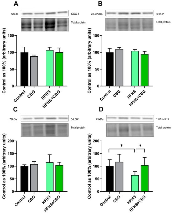 We observed no significant differences in the cyclooxygenase-1 (COX-1), cyclooxygenase-2 (COX-2), and 5-lipooxygenase (5-LOX) expressions (p > 0.05; Figure 4A, Figure 4B or Figure 4C, respectively) in all experimental groups. In the case of 12/15-lipooxygenase (12/15-LOX) expression, there was a reduction in the HFHS group (HFHS: −35.2%, p < 0.05, vs. Control group, Figure 4D), which was elevated after two weeks of CBG administration (HFHS+CBG: +61.0%, p < 0.05, vs. HFHS group, Figure 4D).