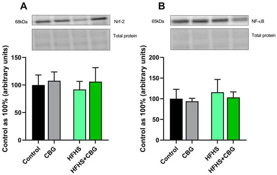 The expression of other proteins involved in the inflammatory response, i.e., nuclear factor erythroid 2-related factor 2 (Nrf−2; (A)) and nuclear factor κ B (NF−κB; (B)) in the kidney tissue of rats subjected to a standard diet (Control) or high-fat high-sucrose diet (HFHS) after two weeks of supplementation of cannabigerol (CBG) solution. The results are shown as the mean ± standard deviation (SD) and based on six individual measurements in each experimental group.