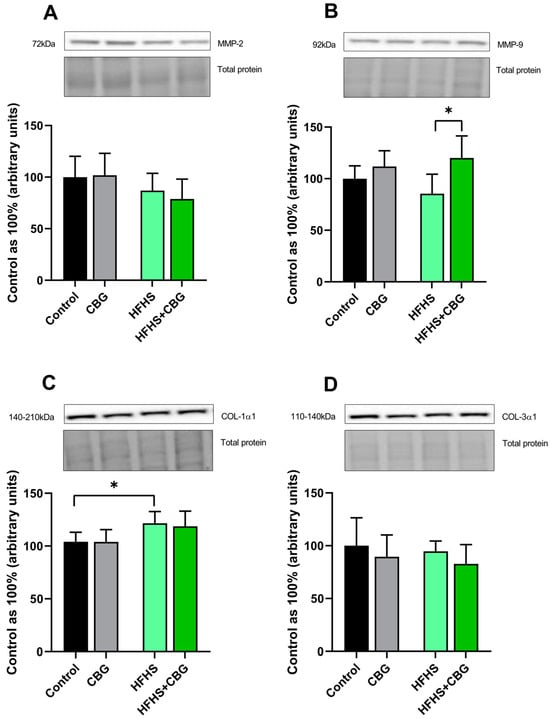 The expression of matrix metalloproteinase 2 (MMP-2) and collagen type 3 α 1 (COL-3α1) was significantly unchanged (p > 0.05; Figure 6A or Figure 6D, respectively) in all experimental groups. In the HFHS+CBG group, the expression of matrix metalloproteinase 9 (MMP-9) was increased (HFHS+CBG: +23.1%, p < 0.05, vs. HFHS group, Figure 6B). Moreover, an HFHS diet caused an increase in collagen type 1 α 1 (COL-1α1) expression (HFHS: +16.9%, p < 0.05, Figure 6C) compared to the rats from the Control group.