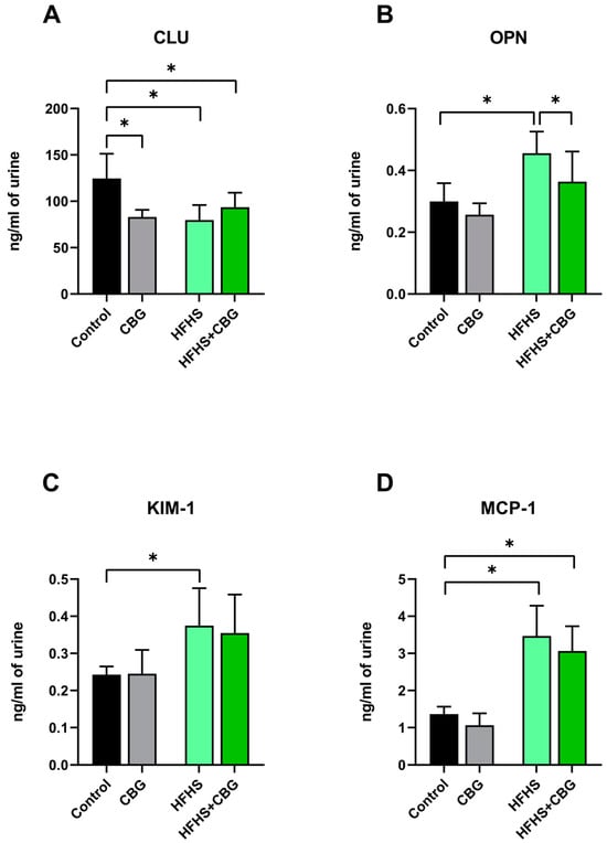 The concentration of kidney toxicity markers, i.e., clusterin (CLU; (A)), osteopontin (OPN; (B)), kidney injury molecule 1 (KIM−1; (C)), and monocyte chemoattractant protein 1 (MCP−1; (D)) in urine samples of rats subjected to a standard diet (Control) or high-fat high-sucrose diet (HFHS) after two weeks of supplementation of cannabigerol (CBG) solution. The results are shown as the mean ± standard deviation (SD) and based on ten individual measurements in each experimental group. * p < 0.05—significant differences.