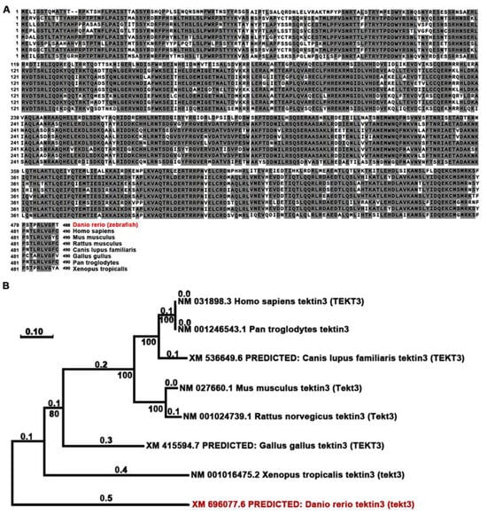 TEKT3/Tekt3 is evolutionarily conserved. (A) Amino acid sequences of zebrafish and a few mammalian TEKT3/Tekt3 are aligned, and the resulted phylogenetic tree (B) reveals that zebrafish Tekt3 is older than human TEKT3 in evolution. Zebrafish (Danio rerio) is highlighted in red color in (A,B).