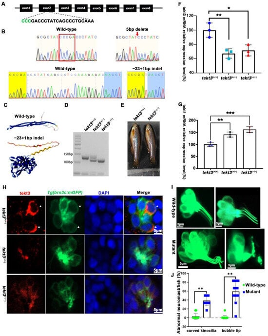 The whole-mount in situ hybridization (WISH) of zebrafish was performed according to the following standard procedures. The cDNA fragment of zebrafish tekt3 was amplified via PCR using designed primers—tekt3-ISH-F, 5′AGATTTCAGCGCTGTCCGAT′ and tekt3-ISH-R 5′ AAGCAGCACGTTCACTCTGA3′—and was cloned into an EZ-T cloning vector with an EZ-T Fast Ligation Kit (GenStar, #T168-10, Beijing, China). After linearization of the EZ-T-inserting tekt3 fragment, the DIG RNA Labeling Kit (T3 & T7) (Roche, #11175025910, Indianapolis, IL, USA) was used to prepare digoxigenin-labeled tekt3 sense and antisense mRNA probes through transcription in vitro. The 3 dpf and 5 dpf embryos were anesthetized with 0.016% (w/v) anesthetic tricaine/E2 medium on ice for 3 min and then fixed in 4%PFA at 4 °C overnight, digested in proteinase K at RT for 10 min, and incubated with a pre-hybridized mix at RT for 1 h. After that, the embryos were hybridized with tekt3 sense or antisense probes overnight at 65 °C. After incubation with alkaline phosphatase (AP)-conjugated antibody against digoxigenin (Roche, #11093274910) at 4 °C overnight, the NBT/BCIP solution (Roche, #11681451001) was used to detect the tekt3 mRNA expression.
