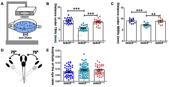 Heterozygous tekt3 mutant has weaker response to soundwave stimuli. (A) Self-made equipment to measure neuromast function (B,C) showed that the 6 dpf heterozygous tekt3 mutant exerted weaker response upon 75 Hz (B) or 800 Hz (C) stimuli. (D) A diagram of a larval zebrafish in linear VOR test. (E) The 5 dpf tekt3 mutant had a normal VOR score. ** p < 0.01; and *** p < 0.001.