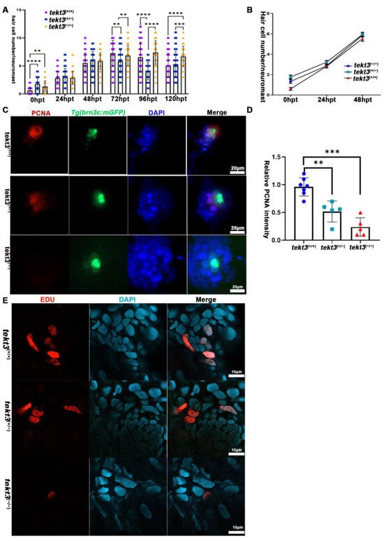 Neuromast HC regeneration is delayed in tekt3 mutant. (A) The summary of HC numbers in L1-L3 neuromasts, days after neomycin administration. (B) The HC regeneration. (C,D) PCNA staining shows neuromast cell proliferation defect of tekt3 mutant. (E) EDU staining shows neuromast cell proliferation defect of tekt3 mutant 6 h after neomycin treatment. ** p < 0.01; *** p < 0.001; and **** p < 0.0001.
