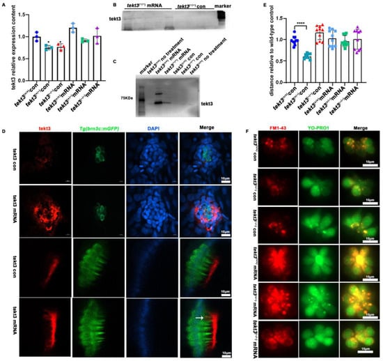 The rescue of tekt3 mutant. (A) Comparison of tekt3 mRNA levels between control and experiment groups is shown. (B,C) The protein level could be brought back a bit in the injected groups. (D) Rescued neuromast and utricle of tekt3 mutant. (E) The rescued startle response in mRNA injection groups. (F) The YO-PRO1 and FM1-43 intakes become normal in mRNA injected groups. The white arrow is pointed to a kinocilium with positive tekt3 signals. * p < 0.05; and **** p < 0.0001.