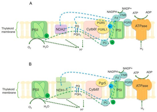 - Munekage, Y.; Hojo, M.; Meurer, J.; Endo, T.; Tasaka, M.; Shikanai, T. PGR5 is involved in cyclic electron flow around photosystem I and is essential for photoprotection in arabidopsis. Cell 2002, 110, 361–371. [Google Scholar] [CrossRef]