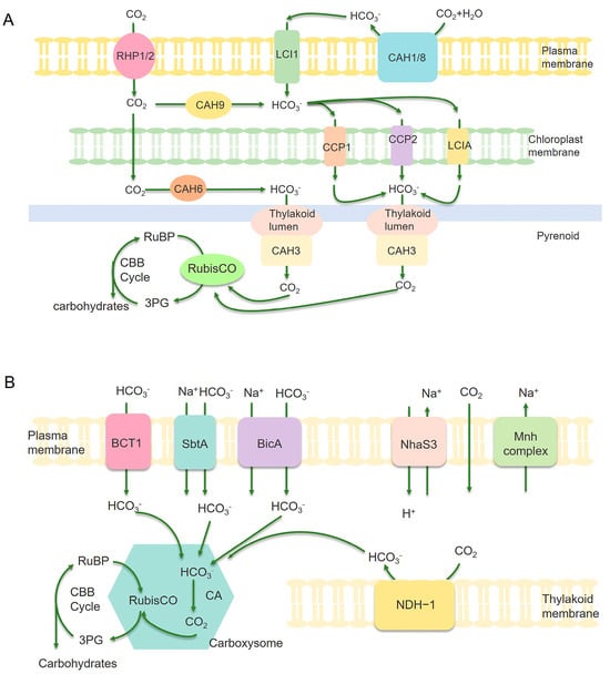 - Tomar, V.; Sidhu, G.K.; Nogia, P.; Mehrotra, R.; Mehrotra, S. Regulatory components of carbon concentrating mechanisms in aquatic unicellular photosynthetic organisms. Plant Cell Rep. 2017, 36, 1671–1688. [Google Scholar]