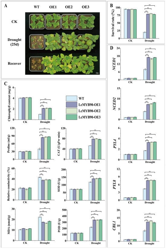2.4. Overexpression of LcMYB90 Increases the Expression of Drought-Related Genes in Transgenic Tobacco