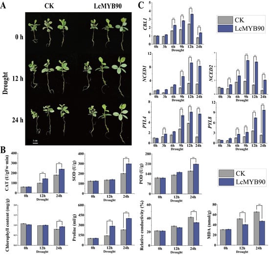 3.1.2. Regulation of Drought-Stress-Related Genes by LcMYB90
