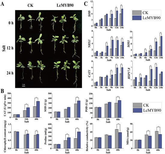 3.2. Involvement of LcMYB90 in Response to Salt Stress