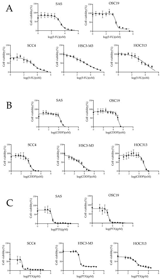 The half-maximal inhibitory concentration (IC50) was quantified via four-parameter nonlinear logistic regression. The sensitivity to fluorouracil (5-FU), cisplatin (CDDP), and paclitaxel (PTX) were investigated at concentrations of 0–300 µM, 0–800 µM, and 0–3 µM, respectively (Figure 1), and the IC50 values of 5-FU, CDDP, and PTX for each cell line were calculated (Table 1).