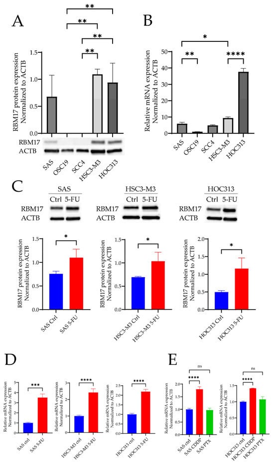 (A) Western blotting was performed to examine the expression of the RBM17 protein in OSCC cell lines. The intensity of the detected bands was quantified and compared using the image analysis software ImageJ 1.53k. Triplicate blots are shown in the Supplementary Materials (Figure S1A). ** p < 0.01 (B) The mRNA expression of RBM17 in OSCC cell lines was analyzed by RT-PCR. * p < 0.05, ** p < 0.01, **** p < 0.0001. (C) The 5-FU-exposure of SAS, HSC3-M3, and HOC313 cell lines for a period of seven days induced an observable increase in RBM17 protein expression. The intensity of the detected bands on Western blots was quantified and compared using the image analysis software ImageJ. Triplicate blots are shown in the Supplementary Materials (Figure S1B). * p < 0.05. (D) The 5-FU-exposure of the same cell lines for a period of seven days also induced an increase in the expression of the RBM17 mRNA. (E) Following a 48-h exposure to CDDP or PTX, the mRNA expression of RBM17 was found to be increased by CDDP, while no change in expression was observed by PTX in either the SAS or HSC3-M3 cell lines. *** p < 0.001, **** p < 0.0001. Each experiment had three biological replicates. All data are represented as mean ± SD.