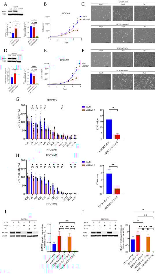 The alterations in 5-FU sensitivity upon RBM17 gene knockdown. (A,D) Following the siRNA-mediated RBM17 knockdown in the HOC313 and HSC3-M3 cell lines, respectively, the mRNA expression was examined using RT-PCR and the protein expression was examined by Western blotting. Each experiment had three biological replicates. Triplicate blots are shown in the Supplementary Materials (Figure S2A,B). * p < 0.1, ** p < 0.01, *** p < 0.001, **** p < 0.0001. (B,E) The cytotoxic effect of RBM17 siRNA was determined by a cell proliferation assay of the HOC313 and HSC3-M3 cells, respectively. The observed partial inhibitory effect on cell proliferation in RBM17-knockdown cells was expected since RBM17 is a general splicing factor for a subset of introns. (C,F) The status of the HOC313 and HSC3-M3 cells, respectively, were examined by microscopy three, five, and seven days following the transfection of siRNAs. A higher percentage of dead cells was observed in RBM17 siRNA treated cells compared with that in control siRNA treated cells. (G,H) The HOC313 and HSC3-M3 cell lines, respectively, were exposed to 5-FU at doses ranging from the indicated concentrations, and the resulting absorbance was quantified via an MTT assay after a seven-day incubation period. (Each black dot in the graph represents an individual trial). In addition, the IC50 of RBM17 siRNA-treated cells and the control were measured. The IC50 values for HOC313 siCtrl and HOC313 siRBM17 were 15.867 µM (12.858–19.610) and 4.054 µM (2.986–5.484), and for HSC3-M3 siCtrl and HSC3-M3 siRBM17 were 1.422µM (1.266–1.597) and 0.3806 (0.349–0.415), respectively. * p < 0.05, ** p < 0.01. (I,J) HOC313 and HSC3-M3 cells, respectively, transfected with either control siRNA or RBM17 siRNA, were exposed to 5-FU, and the expression levels of RBM17 were determined through Western blot analysis. Each experiment had four biological replicates. Data are represented as mean ± SD. Quadruplicate blots are shown in the Supplementary Materials (Figure S2C,D). * p < 0.1, ** p < 0.01.