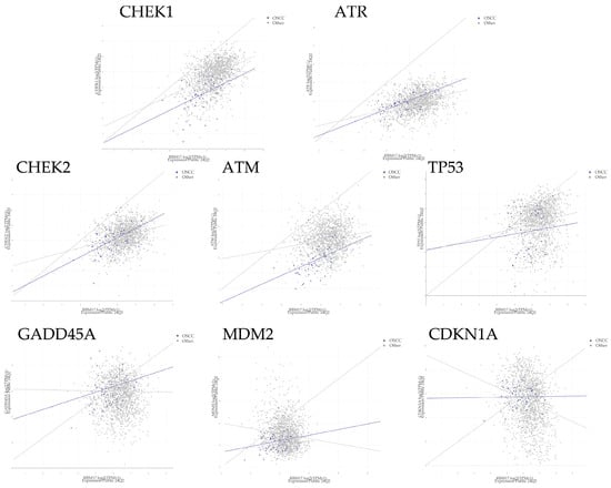 The relationship between RBM17 and DDR-related genes. Correlation analyses between RBM17 and DDR-related genes were conducted using the DepMap portal database and the results demonstrated a statistically significant correlation between the expression of RBM17 and CHEK1 genes (p < 0.001). The lines represent regression lines (gray lines: non-OSCC cancer cells, blue lines: OSCC cells).