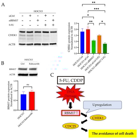 The relationship between RBM17 and CHEK1. (A) Upon silencing RBM17 expression using siRNA in the HOC313 cell line, a notable reduction in CHEK1 protein expression was observed through Western blot analysis. A comparison of siCtrl cell lines treated with 5-FU and siRBM17 cell lines treated with 5-FU also revealed that the RBM17 knockdown cell lines demonstrated a significant reduction in CHEK1 protein expression. The experiment had five biological replicates. Quintuplicate blots are shown in the Supplementary Materials (Figure S3A). * p < 0.05, ** p < 0.01, *** p < 0.001. (B) The expression of the RBM17 protein in the HOC313 cell line treated with a CHEK1 inhibitor (rabusertib) did not exhibit any alterations. The experiment had three biological replicates. Triplicate blots are shown in the Supplementary Materials (Figure S3B). (C) The postulated mechanism of the RBM17-mediated multidrug resistance to cancer chemotherapy. The proposed pathway is based on our two findings: (i) The anticancer drugs 5-FU and CDDP, which cause DNA damage, induce upregulation of the RBM17 gene (up-arrow) and (ii) RBM17 directly or indirectly promotes the expression of a DDR-related gene, CHEK1.