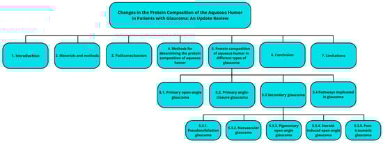 Initially, the methods for determining protein composition were limited and were based mainly on differences in protein masses when comparing healthy and glaucomatous eyes. An example of this is a case-control study conducted by Zaidi et al. in 2010 []. In their study, 0.1 mL of aqueous humor from the anterior chamber was collected from the participants and analyzed by the Bradford method. The molecular weight of the proteins was analyzed using sodium dodecyl sulfate–polyacrylamide gel electrophoresis (SDS-PAGE). The study showed that the difference in the protein contents between the groups was statistically significant, but it did not provide information on the type of proteins detected [].