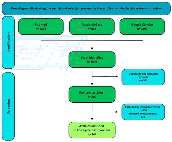 A comprehensive search of the literature was conducted in English using the PubMed, ResearchGate, and Google Scholar databases, covering publications from 1 January 2006 to 31 December 2024. The search employed the following keywords: “proteome change in aqueous humor glaucoma”, “proteomic change in aqueous humor glaucoma”, “change in proteome in primary open-angle glaucoma”, “aqueous humor in different types of glaucoma” and “change in aqueous humor in angle-closure glaucoma”. Figure 2 details the screening workflow, illustrating the attrition of records from initial identification (n = 4691) to final inclusion (n = 144) with documented exclusion reasons. The initial search yielded a substantial number of results, which were screened for relevance based on titles and abstracts. Studies were included if they focused on the protein composition of the aqueous humor in glaucoma patients, provided original data (e.g., experimental studies, clinical trials), were published within the specified timeframe (2006–2024), and were written in English. The exclusion criteria included non-English publications and studies not directly related to glaucoma or aqueous humor proteomics. After applying the inclusion and exclusion criteria, a total of 144 articles were selected for the in-depth review. Reference management software (Zotero v. 7.0.15 was used to organize the retrieved articles and remove duplicates.