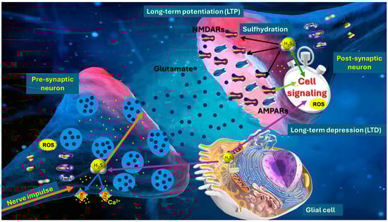 Parallel to its direct interaction with the NMDA receptor, H2S has been involved in shaping the durability and strength of synaptic changes, particularly long-term potentiation (LTP) and long-term depression (LTD) [], the most intensively studied forms of synaptic plasticity, serving as fundamental mechanisms that underlie learning, memory, and adaptive information processing in the brain [].