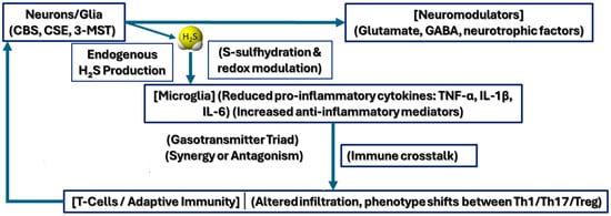 Beyond microglia, H2S also modulates adaptive immunity (Figure 2) in autoimmune settings, as demonstrated in multiple sclerosis (MS) models, where T-cell infiltration and activation in the central nervous system (CNS) are key drivers of demyelination []. H2S-mediated redox alterations can influence T-cell trafficking, skew T-cell lineage commitment (e.g., Th17 vs. regulatory T cells), and modify the blood–brain barrier’s permeability to immune cells. By tempering excessive neuroinflammation while supporting critical housekeeping and repair processes [], H2S exerts both direct and indirect influences on synaptic homeostasis. This dual role reflects the complexity of H2S signaling in diseased states, where small shifts in local H2S levels or redox balance may tip the scale between protective or detrimental immune responses, offering a potential therapeutic avenue for disorders marked by chronic neuroinflammation such as MS [].