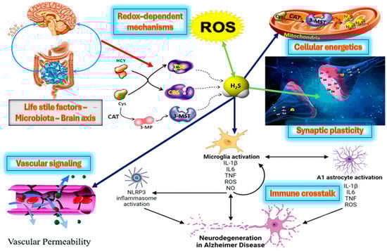 H2S as a key regulator of neurobiology and neurodegeneration, showing how lifestyle factors (e.g., diet, physical activity, and microbiota composition) can modulate H2S-generating enzymes. H2S also boosts synaptic plasticity, supporting processes such as long-term potentiation. By counteracting NOD-like receptor family pyrin domain-containing 3 (NLRP3) inflammasome activation, H2S can attenuate the local production of IL-1β and help prevent the sustained microglial overactivation that drives neurodegenerative progression.
