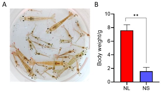 After 90 days of rearing, L. vannamei exhibited significant differences in growth performance (Figure 1A). The shrimp were categorized into two groups on the basis of body weight: the fast-growing group (NL, 7.59 ± 0.57 g) and the slow-growing group (NS, 1.58 ± 0.58 g). The average weight of the NL group was significantly greater than that of the NS group (p < 0.01) (Figure 1B), indicating a pronounced growth disparity under identical rearing conditions.